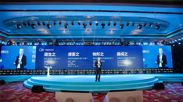 現在我想得更清楚了,這就是《道德經》五十一章的12個字“道生之、德畜之、物形之、器成之。”我覺得中國優秀的傳統文化、中國哲學其實是我們的根,是我們前進的力量。是我們不斷轉型的力量,在數字化浪潮當中,在面對很多的機遇和挑戰當中,在面臨生存和毀滅的選擇時,我們應該從內心深處問自己,我生命的意義是什么?我想中國有很多的圣人,孔子、王陽明,這些偉大的圣人。圣人之心就是道,臨摹圣人之心就是選擇了正確的人生道路。我們過去之所以有很多的煩惱,源自于心理有很多的障壁。如果我們保持一顆空靈、莊嚴的純凈之心還怕什么。2012年在金蝶困難的時刻,我就回到我家里,那個時候深夜大概12:00,我問自己我這樣干下去有意義嗎?所以我想到了三個堅持:堅持信念、堅持信任、堅持行動。我沒有要求高管、員工大家都講三個堅持,但是在那樣一個轉型過程中,全體員工從內心深處引發了一個共鳴信念就是相信自己的良知。我們堅持下去不會錯,一定有好的結果。所以人生下半場就是在大時代、大機遇面前大奉獻,就像習總書記那樣圍繞祖國和人民把自己的一切奉獻出去。我想有了這樣一種良知和“道”,我們就能找到我們轉型的力量。我們如何開發一個偉大的產品,我們如何創造更大的客戶價值,有了“道”有了良知,我們保持一個至誠之心,誠則明,明則誠,我們心地純凈了,就能與我們的客戶心連心,就更能看清產品的本質、看清行業的本質。這幾年轉型當中,產品的價值觀就是用戶至上,小、快、美,我們不需要像過去一樣開發一個ERP一樣的很龐大、復雜的產品,我們希望從用戶出發不斷地做到極致,不斷地迭代,不斷地與客戶心連心。